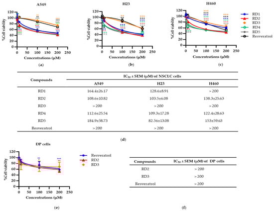 Resveratrol derivatives (RD1-RD5) and resveratrol decreases cell viability in NSCLC cells (A549, H23, and H460) and the normal cell line (DP cells). (a–c) MTT assay was used to evaluate cell viability after treatment with various concentrations of RD1-RD5 and resveratrol (0–200 mM) for 24 h in A549, H23, and H460 cells, respectively. (d) The IC50 of RD1-5 and resveratrol against A549, H23, and H460 cells was calculated from MTT assay by comparison with an untreated control. (e) MTT assay was used to evaluate cell viability after treatment with various concentrations of RD2, RD3, and resveratrol (0–200 mM) for 24 h in DP cells, respectively. (f) The IC50 of RD2, RD3, and resveratrol against DP cells was calculated from MTT assay by comparison with an untreated control. Data are represented as the mean ± SEM. * p < 0.05, ** p < 0.01, *** p < 0.001 when compared with the control group.
