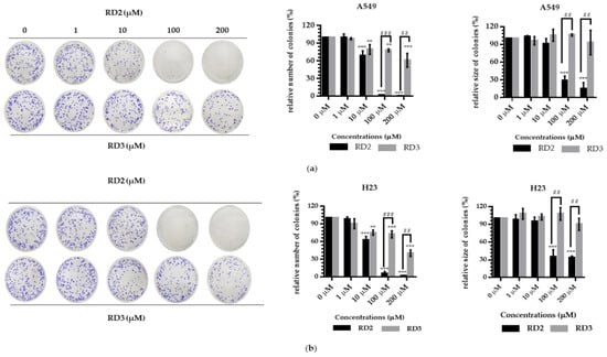 RD3 (10–200 μM) significantly inhibited the number of colony growth compared with the control cells, in a dose-dependent manner. The results show that the number of the forming colony was significantly reduced by 20.44%, 21.94%, and 38.91% in response to the treatment of 10, 100, and 200 μM, respectively, in A549 cells and 24.83%, 27.70% and 59.74% in response to the treatment of 10, 100, and 200 μM, respectively, in H23 cells. However, for RD3, there was no significant effect in the changing colony size in both A549 and H23 cells (Figure 3a,b).