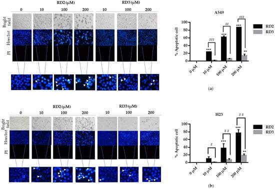 RD2 significantly increased the apoptotic rates compared with the non-treated control cells, in a dose-dependent manner. The apoptotic ratios were 23.25%, 61.26%, and 86.30% in the treatment of 10, 100, and 200 μM, respectively, in A549 cells. In addition, RD2 significantly also increased the apoptotic rates compared with the control cells in a dose-dependent manner. The apoptotic ratios were 36.63% and 75.79% in the treatment of 100 and 200 μM, respectively, in H23 cells (Figure 3c,d). RD3 only significantly increased apoptotic ratios by 13.25% at 200 μM in A549 cells and 18.57% at 200 μM in (Figure 4a,b). According to the previous experiment showing that RD2 had a potent cytotoxicity effect, RD2 had also caused more dead cells than RD3 at the same concentrations (10–200 μM); this was observed from the blue fluorescence of condensed nuclei indicating the early stage of cell death.