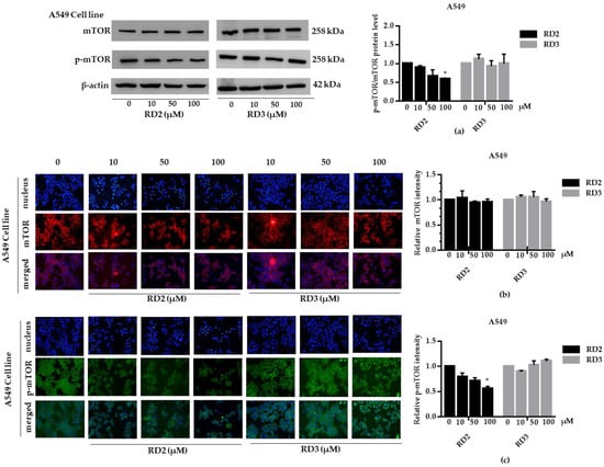 RD2 downregulates p-mTOR in NSCLC cells (A549). The cells were treated with RD2 and RD3 (0–100 μM) for 24 h. (a) Western blot analysis was performed to measure the p-mTOR/mTOR-related proteins. β-Actin protein was evaluated to confirm the equal loading of each protein sample. Densitometry of each protein level was calculated and the results are presented as a relative protein level. (b) A549 cells were stained with mTOR (red fluorescence) and Hoechst 33342 (blue fluorescence). The expression of mTOR was determined by immunofluorescence. (c) A549 cells were stained with p-mTOR (green fluorescence) and Hoechst 33342 (blue fluorescence). The expression of p-mTOR was examined using immunofluorescence. Relative protein levels were quantified by densitometry. Data are represented as the mean ± SEM. * p < 0.05, when compared with the control group.