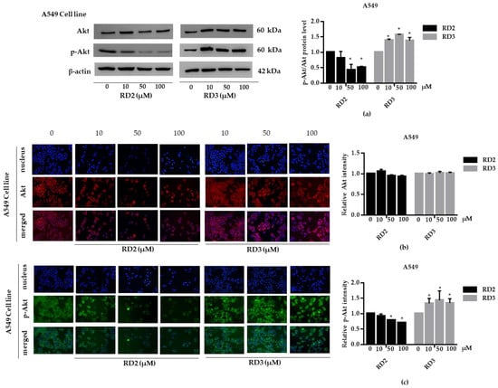 RD2 downregulates p-Akt in NSCLC cells (A549). The cells were treated with RD2 and RD3 (0–100 μM) for 24 h. (a) Western blot analysis was performed to measure the p-Akt/Akt-related proteins. β-Actin protein was evaluated to confirm the equal loading of each protein sample. Densitometry of each protein level was calculated and the results are presented as a relative protein level. (b) A549 cells were stained with Akt (red fluorescence) and Hoechst 33342 (blue fluorescence). The expression of Akt was determined by immunofluorescence. (c) A549 cells were stained with p-Akt (green fluorescence) and Hoechst 33342 (blue fluorescence). The expression of p-Akt was examined using immunofluorescence. Relative protein levels were quantified by densitometry. Data are represented as the mean ± SEM. * p < 0.05, when compared with the control group.
