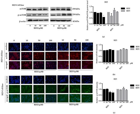 RD2 downregulates p-mTOR in NSCLC cells (H23). The cells were treated with RD2 and RD3 (0–100 μM) for 24 h. (a) Western blot analysis was performed to measure the p-mTOR/mTOR-related proteins. β-Actin protein was evaluated to confirm the equal loading of each protein sample. Densitometry of each protein level was calculated and the results are presented as a relative protein level. (b) H23 cells were stained with mTOR (red fluorescence) and Hoechst 33342 (blue fluorescence). The expression of mTOR was determined by immunofluorescence. (c) H23 cells were stained with p-mTOR (green fluorescence) and Hoechst 33342 (blue fluorescence). The expression of p-mTOR was examined using immunofluorescence. Relative protein levels were quantified by densitometry. Data are represented as the mean ± SEM. * p < 0.05, when compared with the control group.
