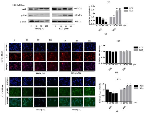 RD2 downregulates p-Akt in NSCLC cells (H23). The cells were treated with RD2 and RD3 (0–100 μM) for 24 h. (a) Western blot analysis was performed to measure the p-Akt/Akt-related proteins. β-Actin protein was evaluated to confirm the equal loading of each protein sample. Densitometry of each protein level was calculated and the results are presented as a relative protein level. (b) A549 cells were stained with Akt (red fluorescence) and Hoechst 33342 (blue fluorescence). The expression of Akt was determined by immunofluorescence. (c) H23 cells were stained with p-Akt (green fluorescence) and Hoechst 33342 (blue fluorescence). The expression of p-Akt was examined using immunofluorescence. Relative protein levels were quantified by densitometry. Data are represented as the mean ± SEM. * p < 0.05, ** p < 0.01, when compared with the control group.