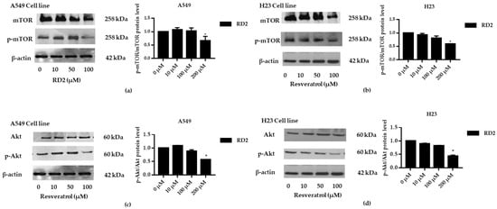 To investigate whether resveratrol inhibits the Akt/mTOR signaling pathway, NSCLC cells (A549 and H23) were treated with resveratrol (10–100 μM) for 12 h. After which, all cells were collected, and the expression levels of Akt, p-Akt, mTOR, and p-mTOR were investigated by Western blot analysis. The results reveal a significant decrease of p-mTOR/mTOR protein expression levels at 100 μM and a significant decrease of p-Akt/Akt protein expression levels at 100 μM of resveratrol treatment compared with the untreated control (Figure 9a–d), while RD2 could reduce p-Akt/Akt protein expression levels at a lower concentration (50–100 μM).