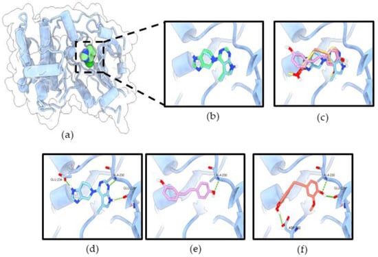 In the ATP-binding site of Akt-1, the binding affinity for resveratrol and RD2 were −8.054 and −8.041 kcal/mol, respectively (Table 1). The binding modes of all ligands revealed that they occupied the same binding site of the co-crystal ligand inhibitor (Figure 10c). The results reveal that all ligands formed a hydrogen bond with key residue Ala230, which is a similar binding pattern to the reference compound (Figure 10d–f). Resveratrol formed only one hydrogen bond interaction with Ala230 in the hinge region of the ATP-binding site. Moreover, previous studies have reported that resveratrol has inhibited Akt activity via interaction with the ATP-binding site of Akt-1 [11,17]. RD2 formed three hydrogen bonds with Glu228, Ala230 in the hinge region, and Asp292 in the DFG motif.