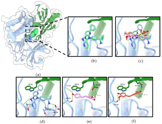 The initial validation of the docking protocol was performed by redocking. The redocking result showed that co-crystal ligands (reference compounds) exhibited similar poses to the original crystal structures (Figure 10b and Figure 11b), which was further confirmed by the root mean square deviation (RMSD) value of 0.451 Å and 0.957 Å, respectively.