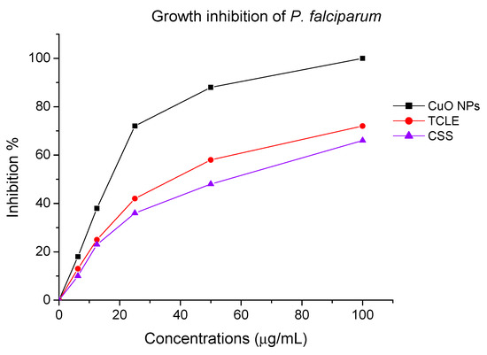 Chicago/Turabian StyleJayaseelan, Chidambaram, Ahmed Abdulhaq, Chinnasamy Ragavendran, and Syam Mohan. 2022. "Phytoconstituents Assisted Biofabrication of Copper Oxide Nanoparticles and Their Antiplasmodial, and Antilarval Efficacy: A Novel Approach for the Control of Parasites" Molecules 27, no. 23: 8269. https://doi.org/10.3390/molecules27238269