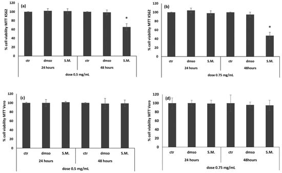 The MTT (3-(4,5-dimethylthiazol-2-yl)-2,5-diphenyltetrazolium bromide) assay was performed on K562 and Vero cells after 24 and 48 h of treatment with two different dosages of S.M. extract: 0.5 and 0.75 mg/mL. Treatment of K562 cells resulted in a time- and dose-dependent viability decrease. In particular, a significant reduction of cell viability after 48 h of incubation with both concentrations was observed (Figure 1a,b). Since the best result was obtained at 48 h with a concentration of 0.75 mg/mL (Figure 1b), this combination was used for the subsequent experiments. There were no significant differences between ctr/dmso and treated Vero cells (Figure 1c,d).