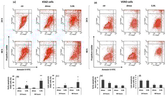 Annexin-V/ PI (propidium iodide) staining quantitatively measured the apoptotic effect of S.M. extract (0.75 mg/mL) on K562 and Vero cells. As shown in Figure 2b, the number of early apoptotic K562 cells significantly increased both 24 and 48 h post treatment. Late apoptotic K562 cells significantly increased with incubation time and became significant at 48 h post S.M. treatment compared to dmso-treated cells (Figure 2c). The percentage of early and late apoptotic cells was not significantly increased in Vero treated with S.M. compared to the dmso group (Figure 2d–f).