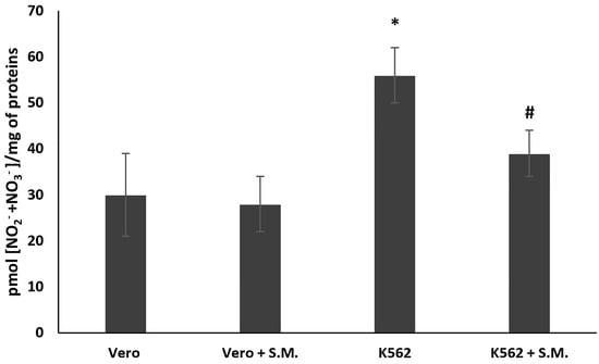 Effect of Skeletonema marinoi (S.M.) on nitric oxide (NO) production in K562 and Vero cells. After 48 h of treatment with 0.75 mg/mL of S.M., nitrites (NO2−) and nitrates (NO3−) levels were assayed by the Griess reagent. Data were represented by the means ± standard deviation (SD) of three experiments. (* p < 0.05 means a significant difference between the Vero and K562 cells; # p < 0.05 means a significant difference between the treated and untreated K562 cells).