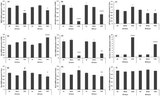 Figure 10 showed that the levels of Bax after treatment with S.M. (0.75 mg/mL) on K562 cells induced a significant increase in the expression; moreover, a suppression of Bcl-2 was observed after 48 h of treatment (Figure 10a–c). In contrast, no effect was observed in Vero cells treated with S.M. (Figure 11a–c). It is interesting to note that the ratio Bax/Bcl-2 is also significatively increased in K562-treated cells in respect to untreated ones (Figure 10d), and no effect was observed in the Bax/Bcl-2 ratio of Vero cells treated with same concentration of S.M. (Figure 11d).