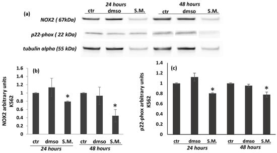 In this work, the levels of NOX2 and its catalytic subunit p22-phox were analyzed by Western blot, showing that S.M. (0.75 mg/mL) was able to reduce both protein levels in K562 cells (Figure 8a–c), while no significant effects were shown in Vero cells (Figure 9a–c). Taken together, these results suggest the existence of interactions between the regulation of ROS production and the apoptotic pathway.