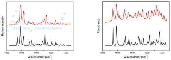 Experimental (red) and calculated (black) Raman (left) and IR (right) spectra of hydrated diosmin (DSNM); for calculated spectra abscissa scale multiplied by a factor of 0.98; Gauss-Lorentz profile with a half-width of 8.9 cm−1 was used to obtain calculated spectra.