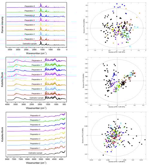 From the top: Raman, MIR and NIR spectra (left) of the studied preparations and distribution of samples in the PC1/PC2 space with the 99% confidence interval (right); black dots—calibration mixtures, colored dots—pharmaceutical tablets.