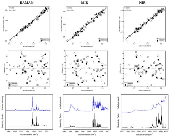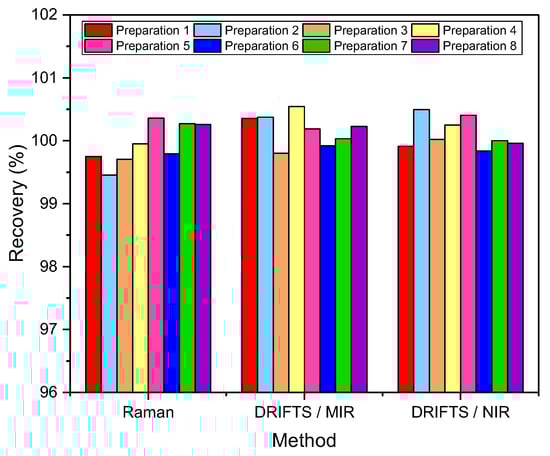 To assess the spectral identity of the prepared calibration mixtures and the commercial diosmin preparations, PCA was performed. For each of the applied spectroscopic techniques, points corresponding to the analyzed preparations, as shown in Figure 3, are evenly distributed in the PC1/PC2 space, constructed based on calibration sample spectra. To determine diosmin content, PLS models were developed for each of the analyzed preparations and techniques applied separately. Spectral ranges selected for the analysis differ slightly depending on the preparation, due to the differences in the composition of tablets originating from different manufacturers, as we have mentioned before. Elaborated PLS models are of similar quality within a given spectroscopic technique. Relative standard errors of prediction are in the range of 1.0–2.4% and 1.1–2.4% for the calibration and test sample sets, respectively (Table 1 and Table S5 in Supplementary Materials). Internal validation of the models using a leave-one-out (LOO) procedure resulted in correlation coefficients of cross-validation in the 0.944–0.964 range. Characteristics of the constructed models are presented in Figure 4, Table 1 and Table S5 in Supplementary Materials. The number of latent variables (5, 6 or 7) was selected based on the RMSECV plots. We determined the diosmin content on the basis of vibrational spectra of the analyzed tablets with a recovery of 99.5–100.5% (Figure 5) with a standard deviation varying in the 0.6–3.4% range (Table S6 in Supplementary Materials). Selectivity ratio (SR), presented in Figure 4, shows spectral contributions of the variables in the projection used in the PLS models. For Raman data, the highest contributions are observed in the frequency range of 1000–1750 cm−1 and 490–790 cm−1. For MIR data, regions 1000–1800 cm−1 and 3000–3700 cm−1 are the most important, while for NIR data, these contributions are large in the 4050–5300 and 6900–7250 cm−1 ranges.