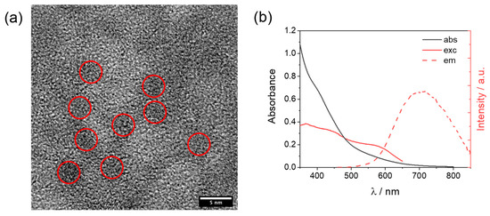 (a) High-resolution TEM image of aqueous CuInS2@ZnS QDs with red circles identifying discrete nanoparticles; (b) absorption, excitation (recorded emission at 700 nm), and emission (excitation at 450 nm) spectra of CuInS2@ZnS QDs in water.