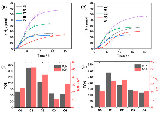 The trend in activity is apparently confirmed at pH 5 (Figure 4b,d), although the differences are slightly attenuated with respect to pH 4. As a matter of fact, under these conditions, C1 (maximum TON = 285, TOF = 35 h−1, QE = 0.20%) still performs better than the remaining complexes (maximum TON = 184, TOF = 22 h−1, QE = 0.12% for C0; maximum TON = 181, TOF = 36 h−1, QE = 0.20% for C2; maximum TON = 146, TOF = 22 h−1, QE = 0.12% for C3; and maximum TON = 120, TOF = 22 h−1, QE = 0.12% for C4).
