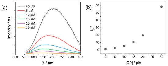 (a) Luminescence spectra (excitation at 450 nm) of CuInS2@ZnS QDs in water upon addition of 0–30 µM C0; (b) plot of the I0/I ratio vs. C0 concentration.