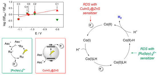 Plot of the log(QECn/QEC0) (where n = 0–4) at pH 4 vs. the half-wave potential of the catalytic wave in acetonitrile for C0–C4 (see Ref. [27]) for the light-driven catalytic data obtained with the photochemical systems based on core-shell CuInS2@ZnS QDs (red triangles) and [Ru(bpy)3]2+ (green triangles) as the sensitizers and schematic representation of the main processes and rate-determining steps involved in photochemical hydrogen evolution with either core-shell CuInS2@ZnS QDs or [Ru(bpy)3]2+ as the sensitizer, ascorbate as the sacrificial donor, and the cobalt complexes C0–4 as the HECs. Abbreviations: CB = conduction band; VB = valence band; Asc− = ascorbate anion; Asc● = ascorbate radical; RDS = rate-determining step.