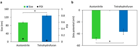 The effect of organic solvents on (a) size, PDI, and (b) zeta potential of PLGA–lipid hybrid nanoparticles (PLHNPs). Data are reported as mean ± SD from three independent experiments, * p < 0.05 compared between the two organic solvents.