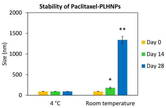 Storage stability of paclitaxel-PLHNPs. Data are reported as mean ± SD from three independent experiments, * and ** p < 0.05 compared to Day 0.