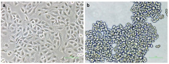 In vitro non-adherent culture using polyHEMA-coated plates has been used to obtain floating cancer cells with an anoikis-resistant property that mimics metastasizing cells in the blood and lymphatic circulatory system [15]. Morphological differences were found between A549 attached cells grown as monolayers (Figure 3a) and A549 floating cells cultivated in polyHEMA-coated plates (Figure 3b). The floating cells exhibited a round shape and formed aggregates similar to the aggregated floating lung cancer cells found in lymphatic vessels of lung cancer patients [32].
