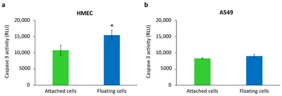Caspase-3 activation in (a) human mammary epithelial cells/HMECs and (b) A549 cells after culturing under adherent condition (attached cells) and non-adherent condition (floating cells) for 24 h. Data are reported as mean ± SD from three independent experiments, * p < 0.05 compared to the attached cells.