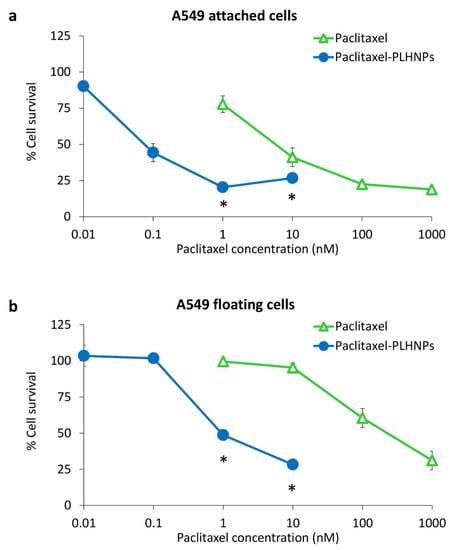 Relative survival rate (%) of (a) A549 attached cells and (b) A549 floating cells treated with paclitaxel and paclitaxel-PLHNPs. * p < 0.05 compared to free paclitaxel.