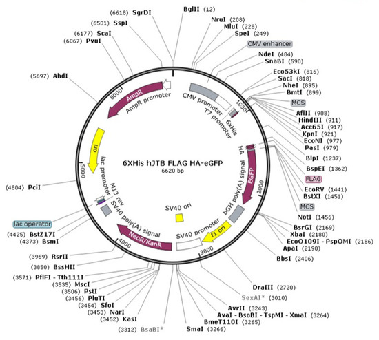 Two plasmids were custom made by Genscript, Piscataway, NJ, USA®. One plasmid was an empty vector with an eGFP tag to serve as control and the other plasmid with hJTB gene containing the full coding region of cDNA, ggtaccGCCACCATGCATCATCATCATCATCATCTTGCGGGTGCCGGGAGGCCTGGCCTCCCCCAGGGCCGCCACCTCTGCTGGTTGCTCTGTGCTTTCACCTTAAAGCTCTGCCAAGCAGAGGCTCCCGTGCAGGAAGAGAAGCTGTCAGCAAGCACCTCAAATTTGCCATGCTGGCTGGTGGAAGAGTTTGTGGTAGCAGAAGAGTGCTCTCCATGCTCTAATTTCCGGGCTAAAACTACCCCTGAGTGTGGTCCCACAGGATATGTAGAGAAAATCACATGCAGCTCATCTAAGAGAAATGAGTTCAAAAGCTGCCGCTCAGCTTTGATGGAACAACGCTTATTTTGGAAGTTCGAAGGGGCTGTCGTGTGTGTGGCCCTGATCTTCGCTTGTCTTGTCATCATTCGTCAGCGACAATTGGACAGAAAGGCTCTGGAAAAGGTCCGGAAGCAAATCGAGTCCATAGACTACAAAGACGATGACGACAAGTACCCATACGATGTTCCAGATTACGCTgatatc corresponding to 146 amino acids of the protein was made. The hJTB cDNA was inserted into a CMV promoter based plasmid in the sense orientation to get the JTB overexpression. This plasmid was further customized with His, HA, FLAG and an eGFP tag to enable confirmation of transfection efficiency (Figure 1).
