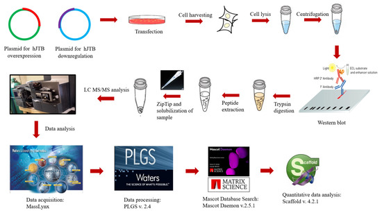 The raw data obtained from Masslynx software were processed in ProteinLynx Global Server (PLGS, version 2.4, Waters Corporation, Milford, MA) software, as described previously [165,166]. The following parameters were used: background subtraction of five adaptive polynomial order with a 30% threshold, three-channel window with two smoothings in Savitzky-Golay mode and centroid calculation of top 80% of peaks based on four channels with minimum peak width at half height. The resulting peak list (pkl) files were searched against the human database for protein identification in the in-house Mascot server (www.matrixscience.com (accessed on 12 October 2021), Matrix Science, London, UK, version 2.5.1) using the following parameters: human databases from NCBI, 0.5% mass error of Da, 0.8 product ion error of Da, enzyme used: trypsin with three missed cleavages and carbamidomethyl cysteine, methionine oxidized and propionamide cysteine as variable modifications. A list of proteins was obtained for each sample that corresponds each gel band. These data files were then uploaded into Scaffold version 4.2.1 software (Proteome software, Inc., Portland, OR, USA) for quantitative analysis [165] (Figure 3).