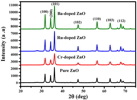 The scientific community has recently focused on ZnO nanostructures due to their biocompatibility, in order to investigate and understand their cytotoxic effects, interactions with biological systems such as nucleic acids, proteins, fats, tissues, cell membranes, biological fluids, etc., and biosafety for the effective usage in the biomedical field [19]. Figure 1 illustrates the X-ray diffraction (XRD) patterns for the pure and Cr-doped ZnO, Ru-doped ZnO, and Ba-doped ZnO samples. X-ray diffraction patterns of pure, Ru-doped and Cr-doped ZnO powders were analyzed to evaluate the influence of Ru and Cr on the structure and size of features of the ZnO. Figure 1 depicts the diffraction patterns for pure ZnO, Cr-doped ZnO, and Ru-doped ZnO samples. From the given figure, seven prominent peaks at 31.7°, 34.6°, 364°, 47.8°, 57.1°, 62.5°, and 67.3° were observed, which might be ascribed to diffraction from the (100), (002), (101), (102), (110), (103), and (112) planes, respectively. The structural properties of ZnO, CrZnO, BaZnO, and RuZnO nanomaterials are presented in Table 1. The pure ZnO nanoparticle feature shows a hexagonal wurtzite phase crystal structure in the XRD pattern (JCPDS: 36-1451) [20]. The researcher documented that the insertion of dopant materials changes the lattice features of the host materials [21]. A Ru dopant in the ZnO crystal lattice does not produce any additional secondary phases. Similarly, no changes in the XRD pattern of Cr-doped ZnO NPs are seen in the diffraction data. It is worth noting that the intensity of the XRD peak reduces in Cr-doped ZnO, but it increases in Ru-doped ZnO. This could be attributed to the larger ionic radius of Cr (0.063 nm) compared to the Ru ionic radius (0.062 nm), hence a decrease in the XRD peak would be expected. Additionally, sharp or powerful peaks suggest a higher level of order, crystallinity, and configuration. By contrast, the reduction in peak intensity exhibits a lower level of crystallinity [22,23]. The nanomaterials’ average crystalline size (D nm) was calculated using the famous Scherrer formula from the top peak (101), and the results are tabulated in Table 1 [24].