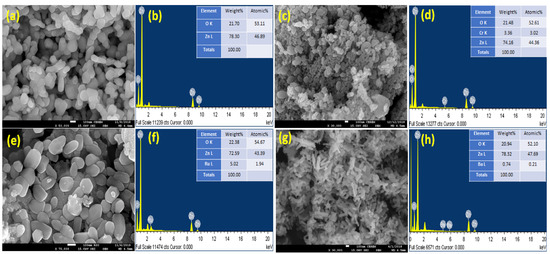 Morphology and chemical composition of ZnO, CrZnO, BaZnO, and RuZnO nanoparticles. (a,b): ZnO, (c,d): CrZnO, (e,f): RuZnO, (g,h): CrZnO.