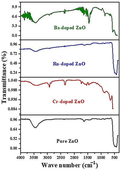 Figure 3 represents the FTIR spectra observed in 500–4000 cm−1 for ZnO, RuZnO, CrZnO, and BaZnO nanomaterial. The wide band at 3378–3395 cm−1 referred to the O–H stretching vibration of the acetate -COOH precursor and adsorbed H2O humidity [26]. The Zn–O bonding matches the 482 cm−1 stretching wavelengths, verifying the production of ZnO. IR bands associated with O–H bonding at 1451 cm−1 demonstrate a greater transmission level in BaZnO, which might be related to the difference in Zn+2 and Ba+2 radii as well as the structural changes caused by doping. The measured peak at 2346 cm−1 is a result of the absorption of CO2 in the environment, which exhibit C=O stretching vibrations [27]. Because of the formation of a Zn–Ba–O connection, the peak seems unusually broad, reaching 573 cm−1 [28]. The two intense bands at 1436 and 1077 cm−1 in CrZnO can be equated to the vibration of the Zn–Cr bonds, demonstrating the effective incorporation of Cr ions into ZnO. Furthermore, the bands at 881 cm−1 might represent the stretching vibration of Cr-O. Thus, the production of Cr-O implies that Cr atoms have been incorporated into the ZnO lattice. RuZnO has a prominent peak at 484 cm−1 in its FTIR spectrum, which is likewise related to Zn-O stretching vibrations [29]. FTIR study findings of CrZnO, RuZnO, and BaZnO nanomaterials are consistent with XRD pattern findings. The findings established in the FTIR analysis concur with XRD analysis.