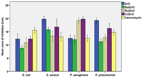 Nanotechnology has recently emerged as one of the most significant technologies for potential antibacterial chemotherapy, owing to its precise targeting, which is associated with a reduction in the dosages needed and, as a result, fewer predicted medication side effects [30]. The antibacterial activity of the investigated nanomaterials (BaZnO, RuZnO, and CrZnO) at a concentration of 1 mg/mL was tested against the referenced bacterial strains representing gram-positive and gram-negative bacteria using the agar well-diffusion technique. Standard antibiotics, vancomycin (1 mg/mL), and ZnO nanoparticles were selected as the control group (at the same dose). The zone of inhibition of the examined bacteria with DMSO (negative control) was not detected. The results demonstrated that the fabricated nanomaterials (BaZnO, RuZnO, and CrZnO) had significant antibacterial activity at 1 mg/mL (p ≤ 0.05) when compared to the antibiotic and ZnO nanoparticles. Generally, the mean zone of inhibition of the ZnO nanomaterial (the control) ranged between 12.2 ± 0.9 mm and 19.7 ± 0.5 mm, and the most susceptible bacterium was S. aureus; vancomycin, at the same concentration, showed inhibition zones ranging between 12.5 ± 0.5 and 15.5 ± 0.5, and the most susceptible bacterium was E. coli. For the fabricated nanomaterials, the BaZnO nanomaterial inhibition zones ranged from 8.7 ± 0.5 mm to 15.7 ± 0.5 mm, and the most susceptible bacterium was S. aureus. The RuZnO nanomaterial inhibition zones ranged from 10.7 ± 0.9 mm to 19.2 ± 0.5 mm, and the most susceptible bacterium was P. aeruginosa. The CrZnO nanomaterial inhibition zones ranged from 12.2 ± 0.5 mm to 19.2 ± 0.5 mm, and P. aeruginosa was the most sensitive bacterium (Figure 4).
