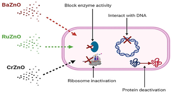 Furthermore, it is thought that the mode of action of antibacterial nanoparticles is distinct from that of conventional antibiotics. The antibacterial activity of ZnO nanoparticles and their derivatives is not well understood and remains a source of contention [51]. Direct contact of ZnO nanoparticles and their derivatives with bacterial cell walls, on the other hand is likely to result in the loss of bacterial cell viability and the release of antibacterial ions [52,53]. Additionally, it is also claimed that that these nanoparticles are capable of accumulating excessive reactive oxygen species (ROS) and metal ions, disrupting normal bacterial cell homeostasis [54]. The current study concludes that BaZnO, RuZnO, and CrZnO nanomaterials may penetrate the bacterial cell membrane and interact with the cell’s basic components such as DNA, ribosomes, or enzymes, leading to protein deactivation based on their potential bacteriostatic effects at 1 mg/mL. Future work on the antioxidant activity and antibacterial mode of action of these novel doped nanomaterials is recommended (Figure 5). Moreover, additional toxicological studies on the nanoparticles synthesized here are required, since several risks and toxicities associated with ZnO nanoparticles have been documented after systemic ZnO nanomaterial exposure [55]. Although several materials and nanoparticle platforms have been created, relatively few articles analyze the nanoparticle platform’s toxicity in detail. Therefore, the development of these nanomaterials has not been accompanied by a serious investigation of their long-term effects to allow the risk-to-benefit ratio to be balanced. Consequently, toxicology studies are needed on these novel nanomaterials [56].