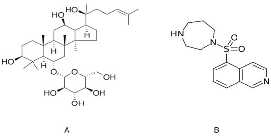 The two-dimensional graphical representation of (A) ginsenoside Rh1 from Panax ginseng and (B) fasudil, a known inhibitor of ROCK1.