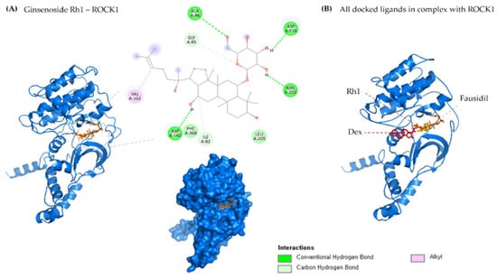 (A) 2D & 3D docking interactions of Ginsenoside Rh1 with ROCK1. (B) All docked ligands in complex with ROCK1 (Orange—Rh1, Pink—Dexamethasone, Yellow—Fausidil).
