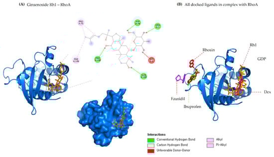 (A) 2D & 3D docking interactions of Ginsenoside Rh1 with RhoA. (B) All docked ligands in complex with RhoA (Orange—Rh1, Pink—Dexamethasone, Yellow—GDP, Magenta—Fausidil, Red—Rhosin, Green—Ibuprofen).