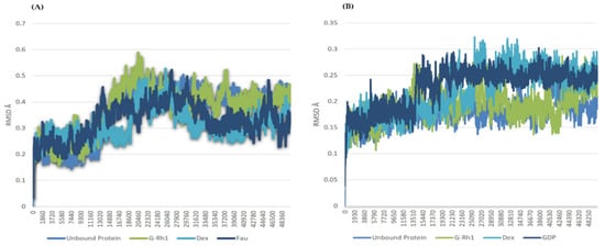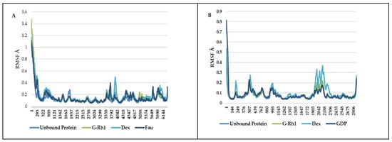 RMSF of ginsenosides Rh1 and control (Dexamethasone, Fausidil) in complex with (A) ROCK1 and (B) G-Rh1 and control (Dexamethasone, GDP) in complex with RhoA as a function of MD simulation time.