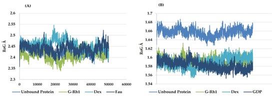 Radius of gyration plots of molecular dynamics (MD) simulation of (A) ROCK1 receptor-ginsenoside Rh1 and control (Dexamethasone, Fausidil) complexes and (B) RhoA receptor-ginsenoside Rh1 and control (Dexamethasone, GDP) complexes.