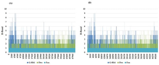 Line plots of Ligand-protein H bonds for (A) ROCK1 and (B) RhoA with Ginsenosides Rh1 and control (Dexamethasone, Fausidil).