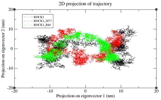 To determine the ROCK1 protein structure change upon ligand binding, we used gromacs utilities. A PCA method called essential dynamics (ED) was followed according to this protocol []. The protein coordinates of ROCK1 and its complexes (ROCK1-fasudil and ROCK1-ginsenoside Rh1) were used as a starting point to calculate the PCA using g covar gromacs utilities. This program computes the corresponding protein motions of eigenvectors, eigenvalues, and projection values. In addition, these principal components were determined based on the mass-weighted covariance matrix of the backbone atoms of each structure. Finally, the g_anaeig gromacs utilities were used to analyze the protein motions based on the 2D projection values for the first two principal components. All dynamics graphics were plotted using Microsoft Excel and the XMGRACE [] program.