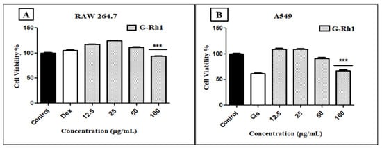 Natural bioactive chemicals are potential sources for developing drugs to treat various diseases. In particular, several ginsenosides have been shown to have pharmacological effects, including anticancer properties [,,]. Among them, Rh1 has been shown to suppress a variety of cancer cell lines, including breast cancer cells, lung cancer A549 cells, and cervical cancer HeLa cells []. Our findings observed the cytotoxicity level of the G- Rh1 on murine macrophage (RAW 264.7) cells, and A549 lung cancer cells were medicated at several concentrations (0, 12.5, 25, 50, 100 μg/mL) for 24 h. In the cytotoxicity experiment, we used MTT solution for measuring the cell toxic level. The cytotoxicity in cancer-free RAW 264.7 cells was evaluated, and samples were determined to be safe. It was observed that the cell viability of RAW 264.7 cells showed low toxicity with G-Rh1 at 100 μg/mL after 24 h (Figure 9A).