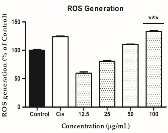 In human lung cancer (A549), 2′,7′dichlorodihydrofluorescein diacetate (DCFH-DA) was used to measure the strength of reactive oxygen species (ROS). To allow attachment in 96-well cell culture plates, we seeded the cells at a density of 1 × 104 per well and left them in the incubator overnight for 100 percent growth confluency. A549 cells were then treated for 24 h with various concentrations of cisplatin (10 μg/mL), (0, 12.5, 25, 50, 100 μg/mL). After 24 h of treatment, the cells were stained with 100 μL of DCFH-DA (10 μM) solution in each well and incubated for 30 min in the dark. The cells were then washed twice with PBS ((100 μL/well), and the old medium was discarded. At an excitation wavelength of 485 nm and an emission wavelength of 528 nm, a multi-model plate reader (spectrofluorometer) was utilized to determine the fluorescence intensity of ROS production. DCFH-DA reagent was used to measure the increase in ROS.
