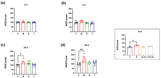 ROS production after treatment with 10 µM morphine (M), 0.25 µM buprenorphine (B) or 10 µM tapentadol (T) in SH-SY5Y cells at different time points (a–d). The right framed insert reports ROS production after cotreatment with 10 µM naloxone (Nal) + 10 µM morphine (M) or 10 µM β-funaltrexamine (β-FNA) + 10 µM morphine (M) in SH-SY5Y cells at 24 h. Data, reported as the mean ± SEM of four/six biological replicates for each treatment, are expressed as the percentage of relative fluorescence (a–d) or the percentage of the intensity of the first spectra line (insert) compared to control (C) and are analyzed by one-way ANOVA followed by Dunnett’s multiple comparisons test (* p < 0.05; ** p < 0.01 vs. control).