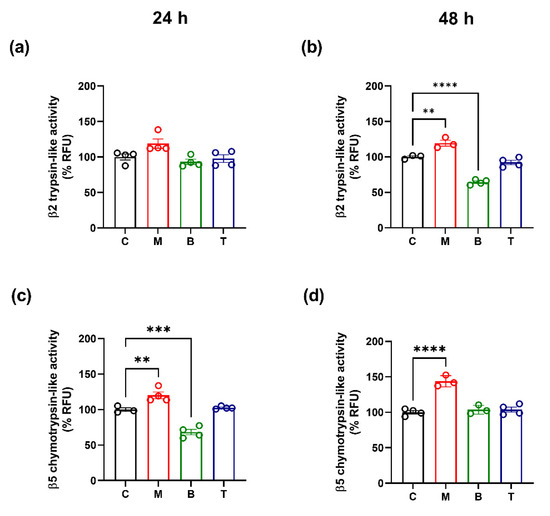β2 trypsin-like (a,b) and β5 chemotrypsin-like (c,d) activities after treatment with 10 µM morphine (M), 0.25 µM buprenorphine (B) or 10 µM tapentadol (T) in SH-SY5Y cells at 24 h (a,c) and 48 h (b,d). Data, reported as the mean ± SEM of three/four biological replicates for each treatment, are expressed as the percentage of relative fluorescence (RFU) compared to control (C) and analyzed by one-way ANOVA followed by Dunnett’s multiple comparisons test (** p < 0.01; *** p < 0.001 vs. control; **** p < 0.0001 vs. control).