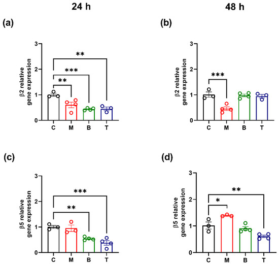 Relative gene expression of β2 (a,b) and β5 (c,d) subunits after treatment with 10 µM morphine (M), 0.25 µM buprenorphine (B) or 10 µM tapentadol (T) in SH-SY5Y cells at 24 h (a,c) and 48 h (b,d). Data, expressed as the mean ± SEM of three/four biological replicates per treatment, represent 2−DDCt values and are analyzed by one-way ANOVA followed by Dunnett’s multiple comparisons test (* p < 0.05; ** p < 0.01; *** p < 0.001 vs. control (C)).