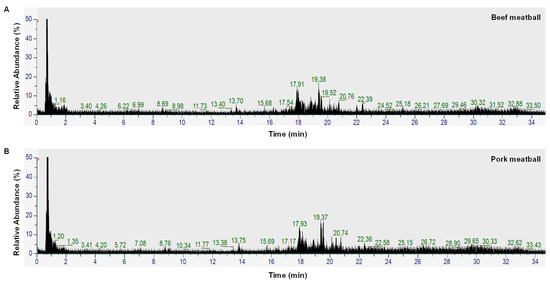 Total ion chromatogram (TIC) of a beef meatball (A) and a pork meatball (B).