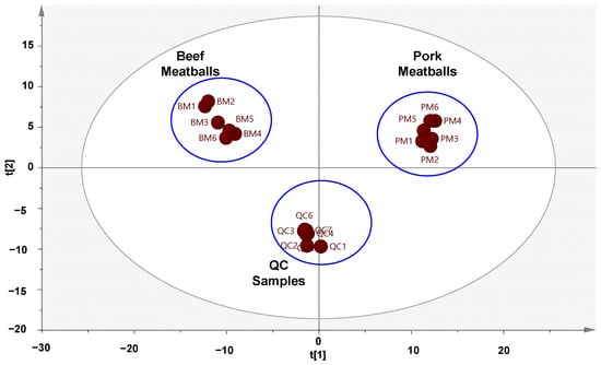 In this study, various metabolites were found, such as amino acids, organic acids, fatty acids, nucleotides, peptides, and lipids. The threshold intensity was 1.6 × 105, both in positive and negative ionization modes. The QC samples showed that the method had good stability and repeatability, demonstrated by good precision in the QC samples’ results. Amino acids and lipids were mostly found in both beef and pork meatballs. Table S2 (Supplementary Materials) demonstrates the amino acids found in meatballs made from beef and pork. Acetyl-l-carnitine, l-norleucine, and l-phenylalanine had a high peak area both in beef and pork meatballs. N-(tert-Butoxycarbonyl)-l-leucine and l-pyroglutamic acid was observed to have a high peak area only in beef meatballs. Meanwhile, compounds of dl-carnitine and isoleucine were found to have a high peak area only in pork meatballs. Table S3 (Supplementary Materials) shows the lipids contained in beef and pork meatballs. Compounds of 1-linoleoyl-2-hydroxy-sn-glycero-3-PC, linoleic acid, and 1-stearoylglycerol were found to be high both in beef and pork meatballs. Meanwhile, a metabolite of 1-oleoyl-2-hydroxy-sn-glycero-3-PE and PC (P-18:0/18:4 (6Z,9Z,12Z,15Z)) was found in a high area only in beef meatballs and pork meatballs, respectively. Therefore, the differentiation and classification of beef and pork meatball samples based on metabolite composition in meatballs is important for the detection of pork adulteration in beef meatballs because the composition of metabolites in adulterated meatball samples will obviously change.