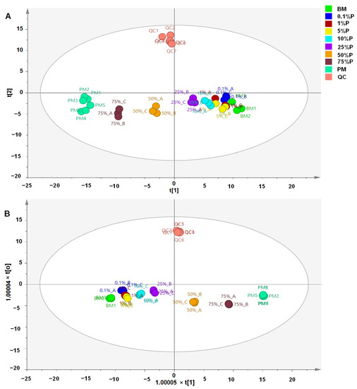 Partial least square-discriminant analysis (A) and orthogonal projection to latent structures-discriminant analysis (B) for discrimination and classification of meatballs made from beef, pork, and a mixture of beef-pork (BM = beef meatballs; PM = pork meatballs; the percentage indicates the percentage of pork added in beef meatballs).